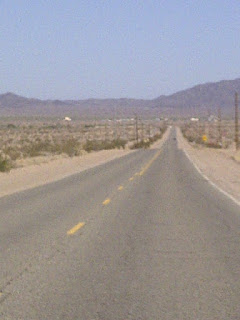 The baking two lane blacktop stretches